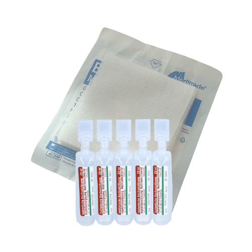 Nutze die Kochsalzlösung (0,9 % NaCl), die in deiner Notfallbox oder -tasche enthalten ist. Damit kannst du die Wunde vorsichtig ausspülen – sie ist sanft, brennt nicht und entfernt Schmutz zuverlässig.