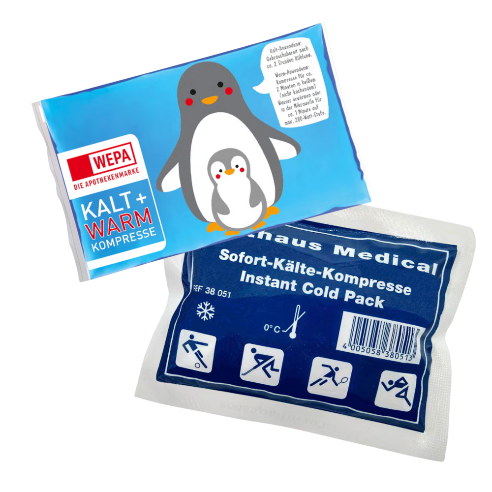 - Sofortkühlpack oder Kalt/Warm Kompresse in der Notfallbox und Notfalltasche enthalten
